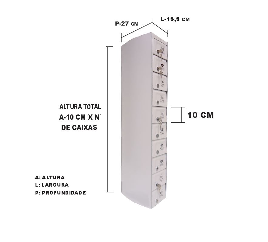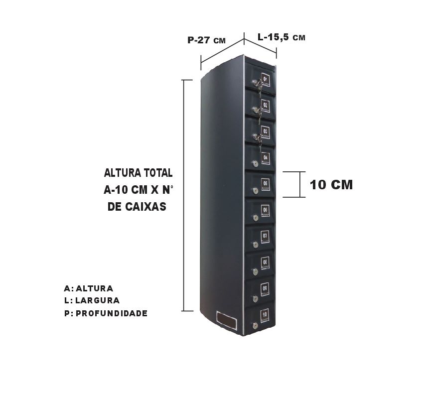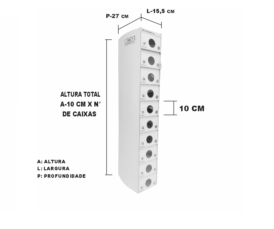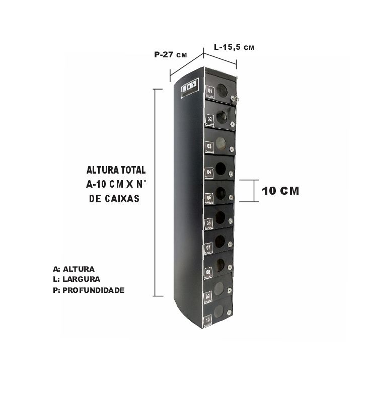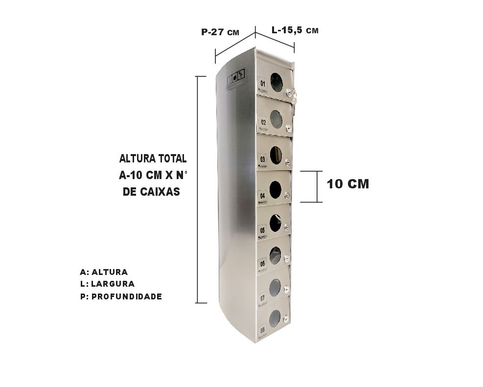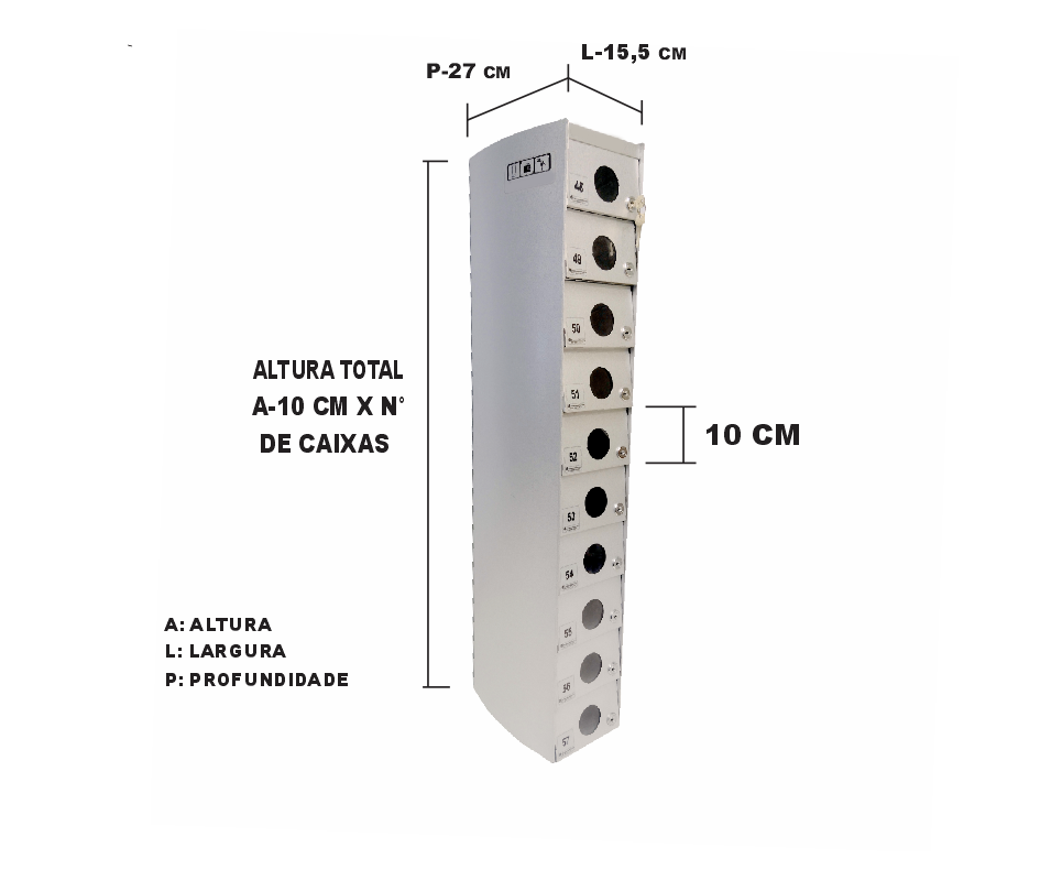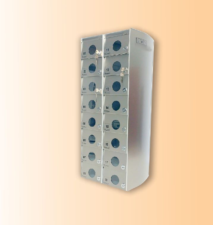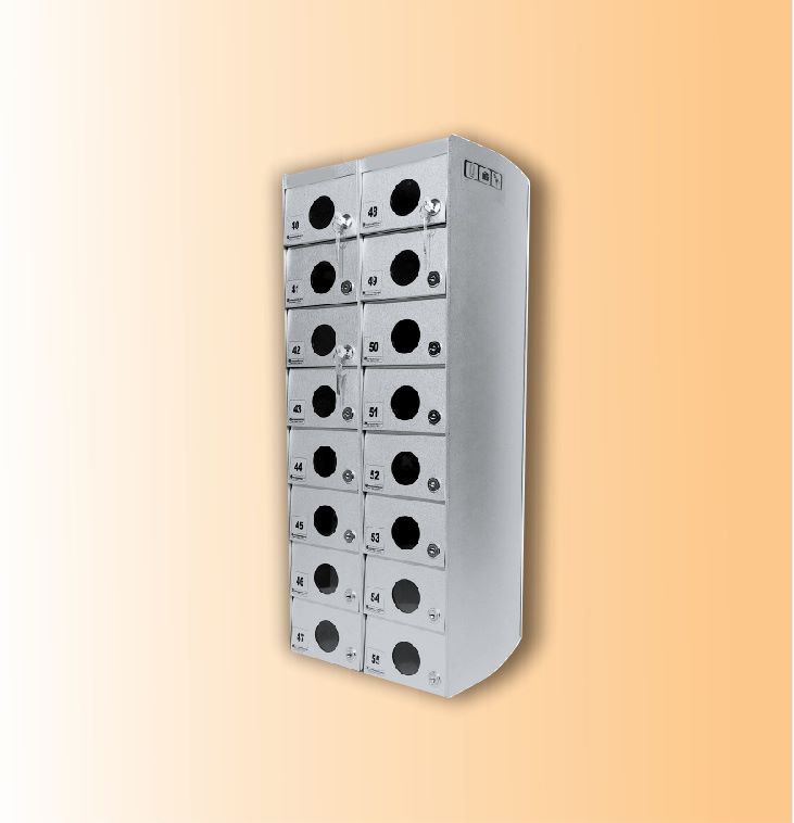 O Armário Guarda Celular é um produto que possui portas com visores ou estampadas em alto relevo, com numeração personalizada de acordo com a necessidade do cliente. Ele também conta com fechadura e duas cópias de chave. A estrutura interna do armário é fabricada em aço carbono revestido com alumínio, enquanto a estrutura externa pode ser em aço inox ou aço com pintura poliéster, disponível nas cores branca, preta, prata e cedro.