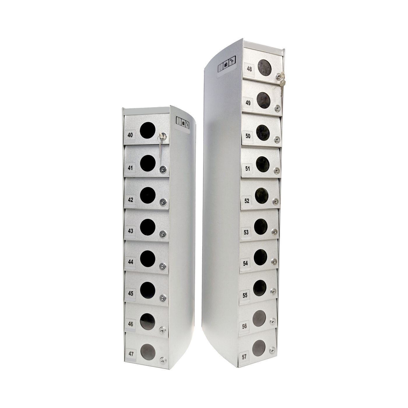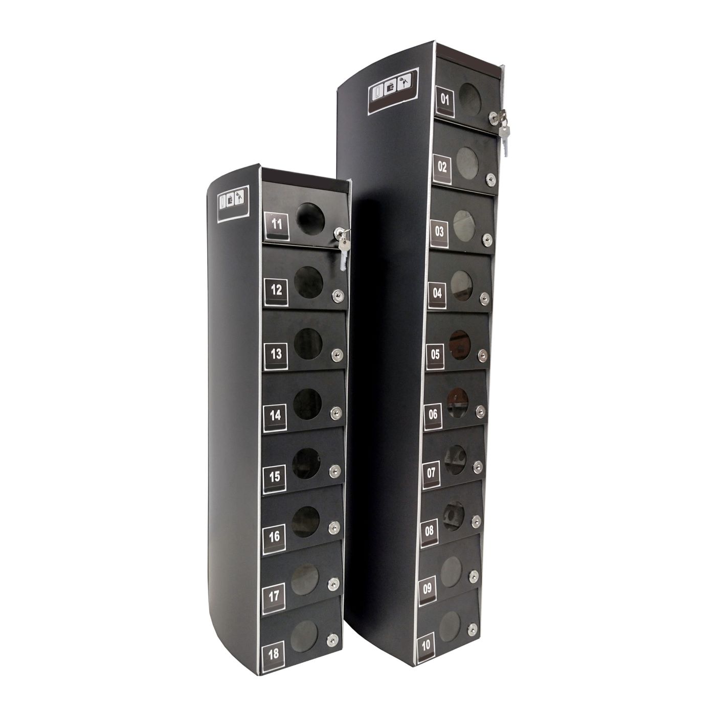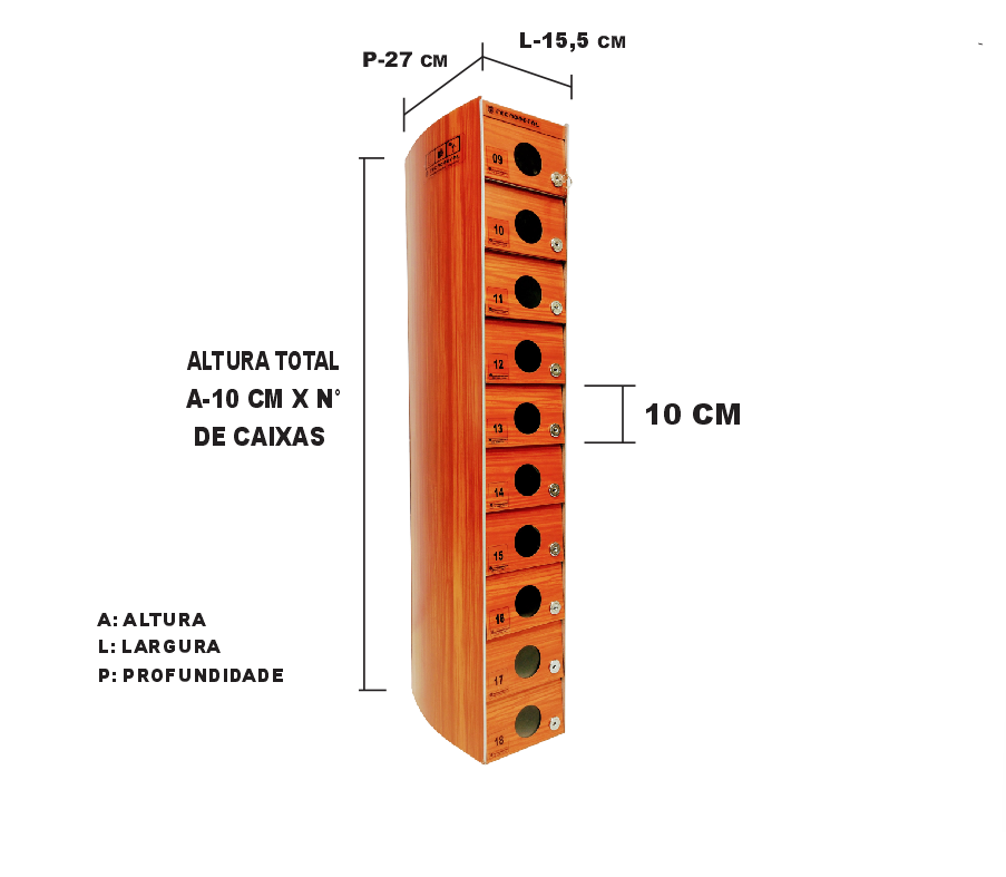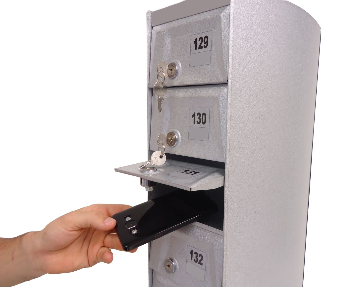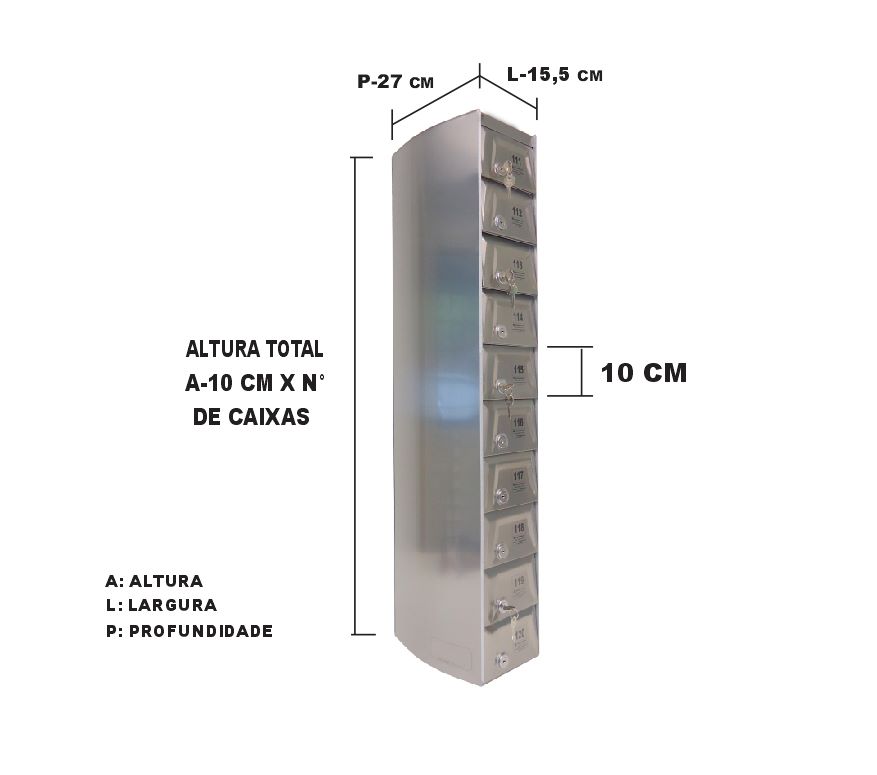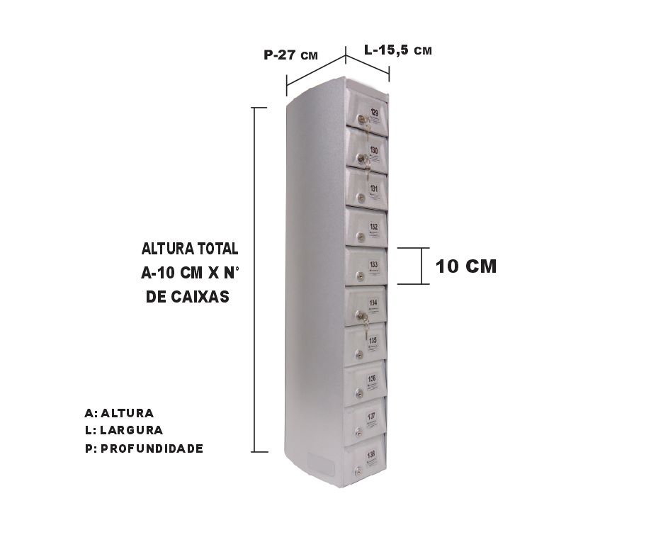 O Armário Guarda Celular é um produto que possui portas com visores ou estampadas em alto relevo, com numeração personalizada de acordo com a necessidade do cliente. Ele também conta com fechadura e duas cópias de chave. A estrutura interna do armário é fabricada em aço carbono revestido com alumínio, enquanto a estrutura externa pode ser em aço inox ou aço com pintura poliéster, disponível nas cores branca, preta, prata e cedro.