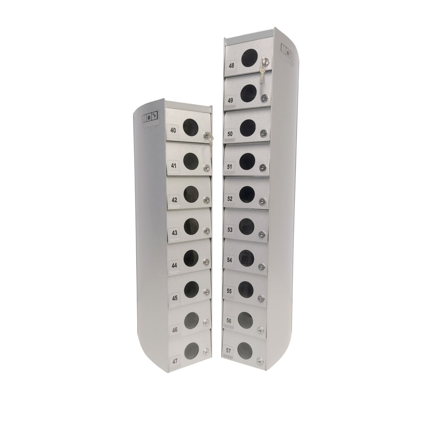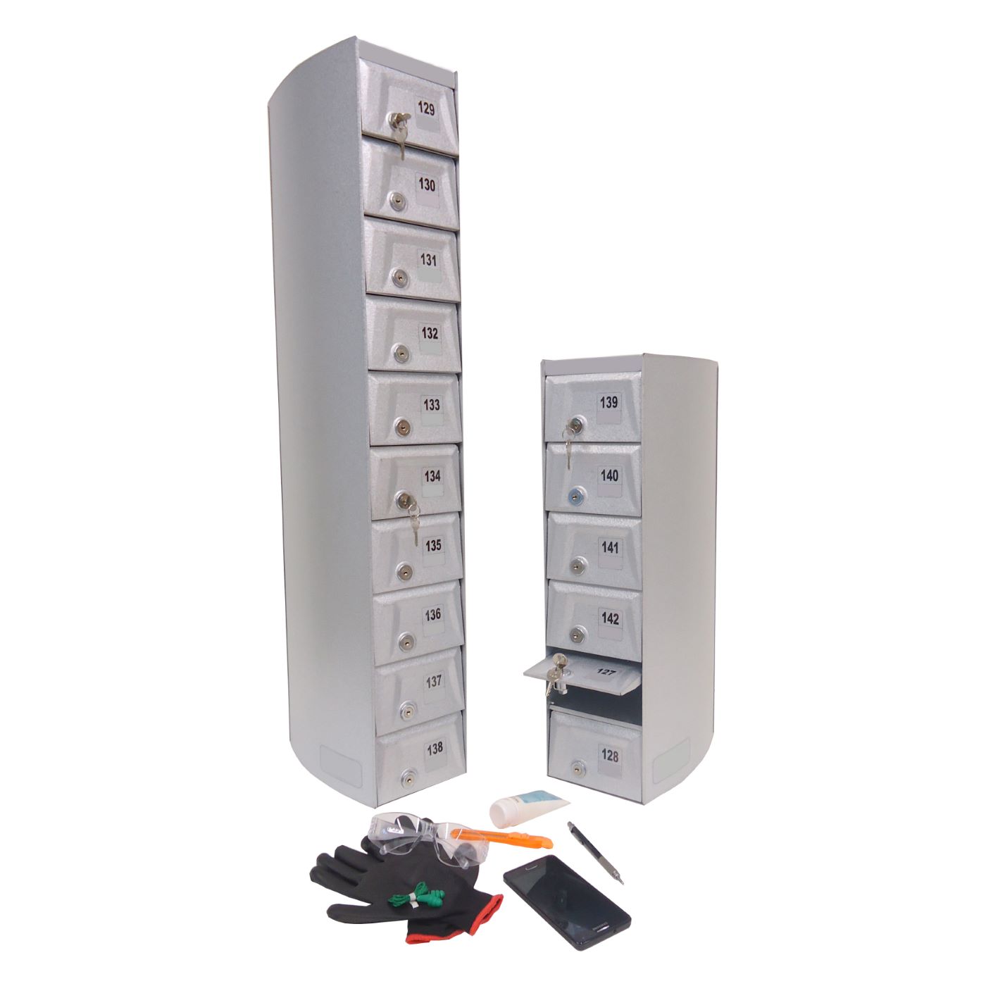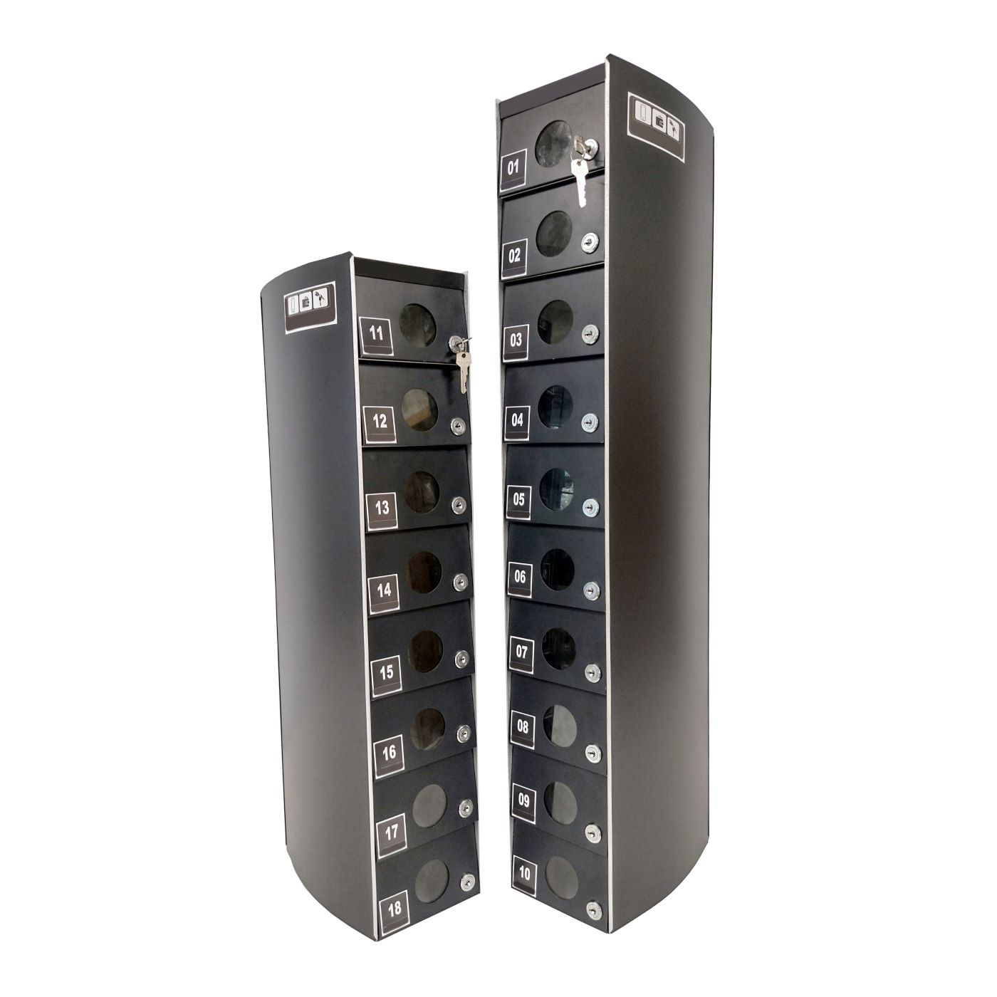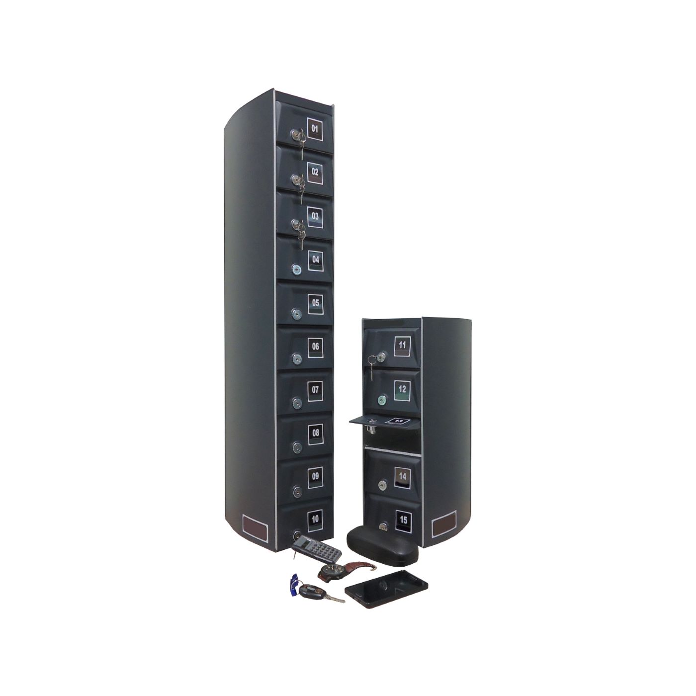 O Armário Guarda Celular é um produto que possui portas com visores ou estampadas em alto relevo, com numeração personalizada de acordo com a necessidade do cliente. Ele também conta com fechadura e duas cópias de chave. A estrutura interna do armário é fabricada em aço carbono revestido com alumínio, enquanto a estrutura externa pode ser em aço inox ou aço com pintura poliéster, disponível nas cores branca, preta, prata e cedro.