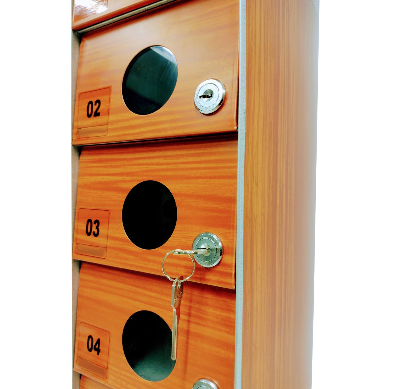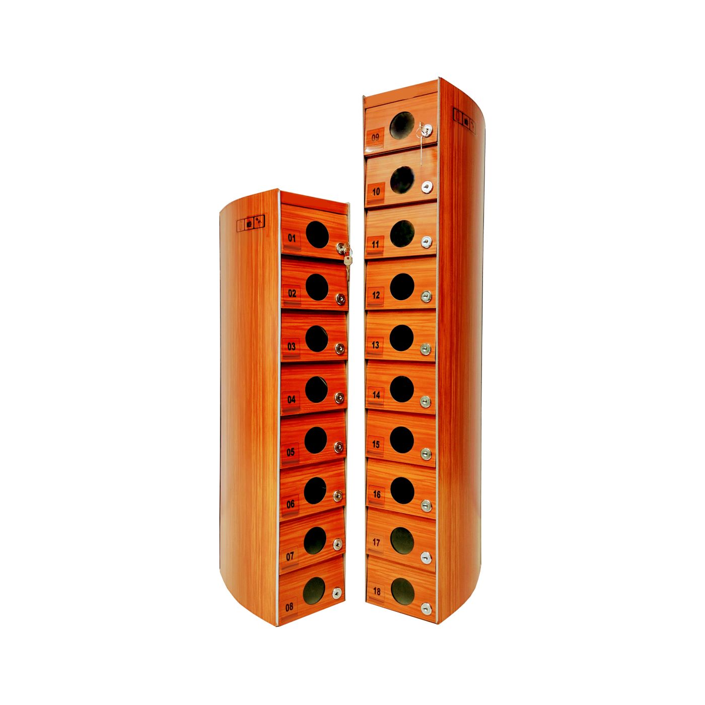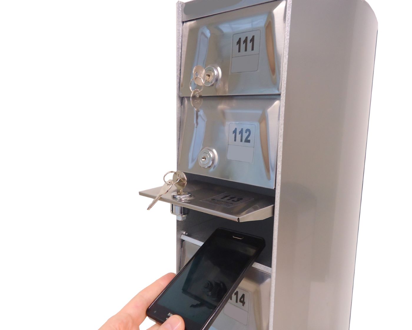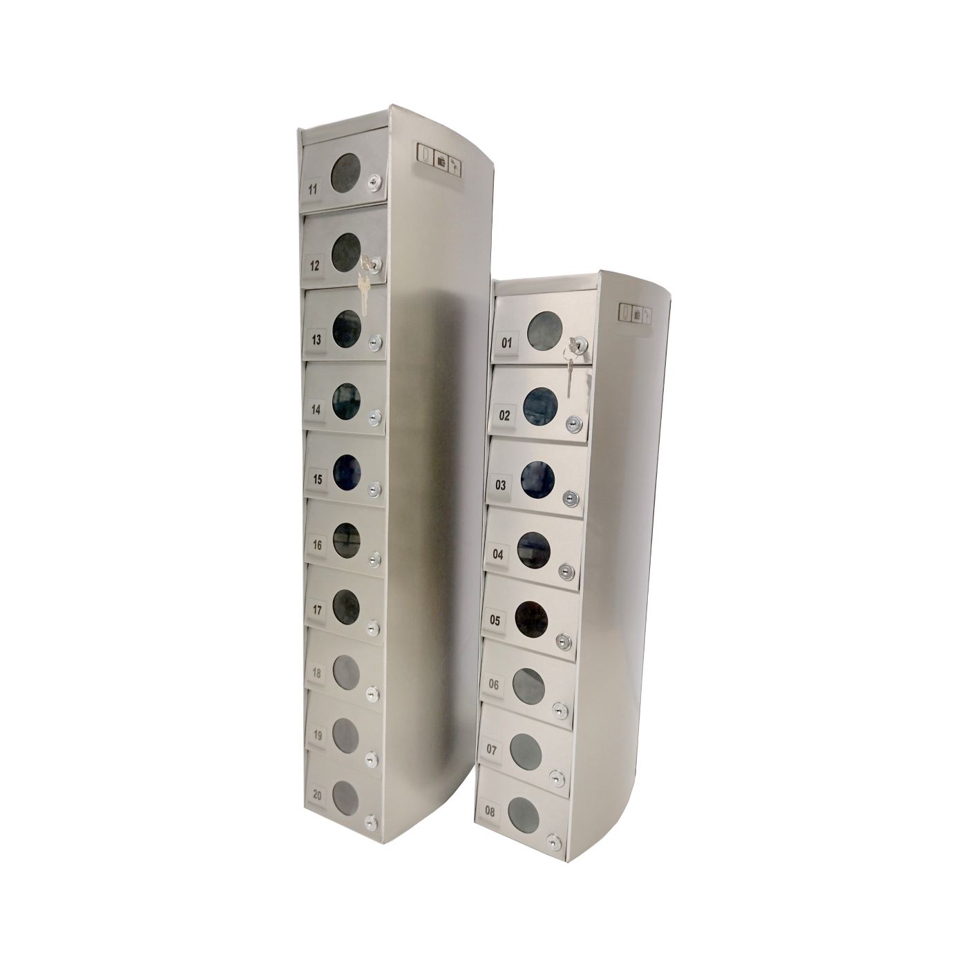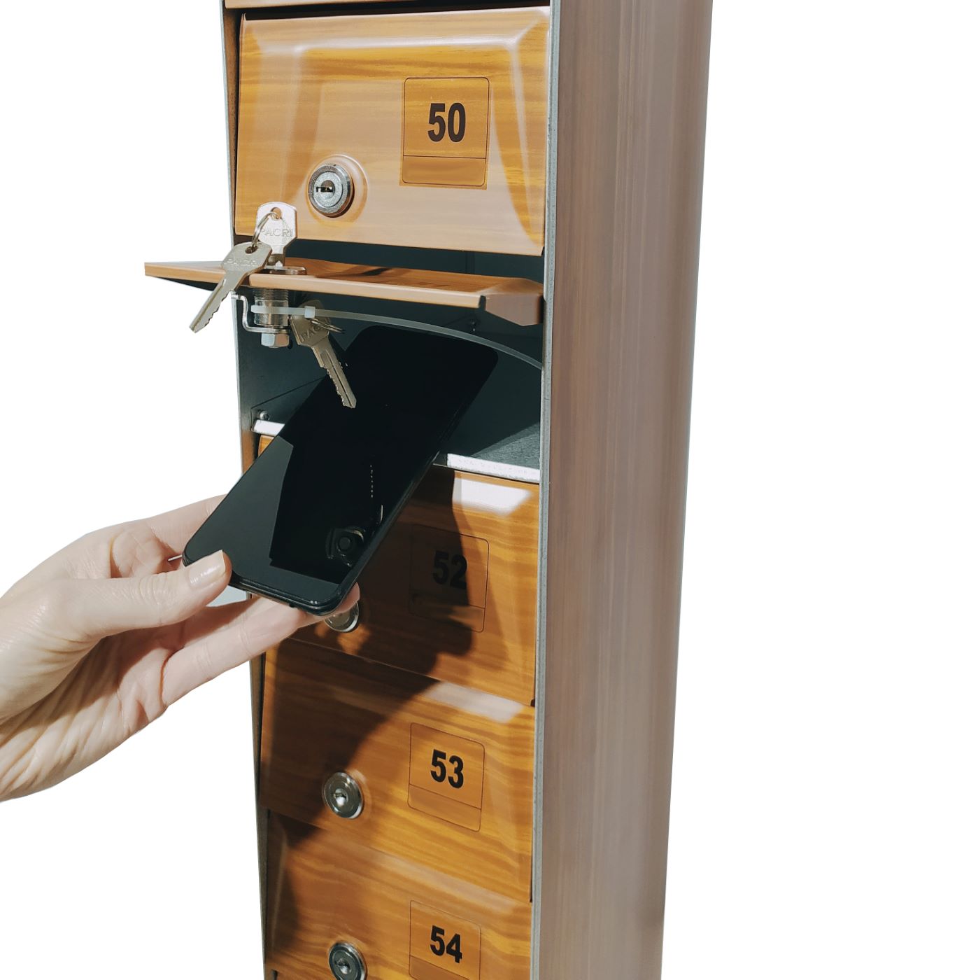 O Armário Guarda Celular é um produto que possui portas com visores ou estampadas em alto relevo, com numeração personalizada de acordo com a necessidade do cliente. Ele também conta com fechadura e duas cópias de chave. A estrutura interna do armário é fabricada em aço carbono revestido com alumínio, enquanto a estrutura externa pode ser em aço inox ou aço com pintura poliéster, disponível nas cores branca, preta, prata e cedro.